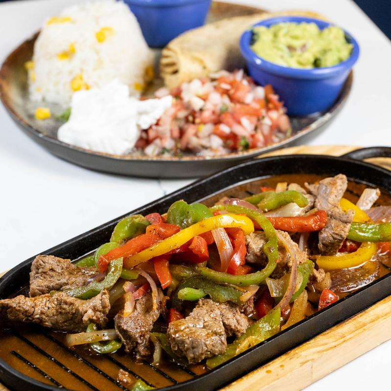 Hanger steak, sauteed peppers and onions, corn rice, beans, tortillas, guacamole, pico de gallo and fresh cream