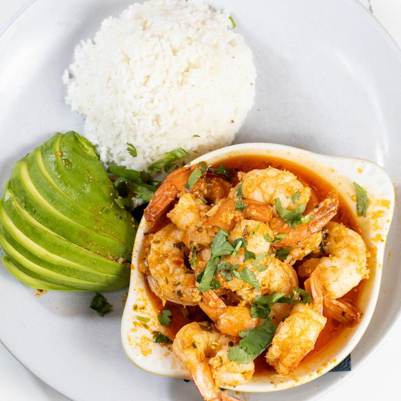 Sauteed shrimp, garlic white wine sauce, white rice and avocado slices